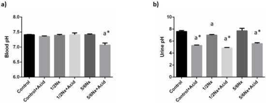 Acid-base parameters. (a) Blood pH, and (b) urine pH in rats (n = 9 per group) with normal (control) and reduced (1/2 Nx and 5/6 Nx) renal function without and with (+Acid) metabolic acidosis. a p < 0.05 vs. control; * p < 0.05 vs. its non-acidotic counterpart.