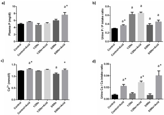 Plasma concentrations and urinary excretion of phosphate and calcium. (a) Plasma phosphate, P, (b) urinary excretion of P, (c) plasma ionized calcium, Ca2+, and (d) urinary excretion of Ca in rats (n = 9 per group) with normal (control) and reduced (1/2 Nx and 5/6 Nx) renal function without and with (+Acid) metabolic acidosis. a p < 0.05 vs. control. * p < 0.05 vs. its non-acidotic counterpart.