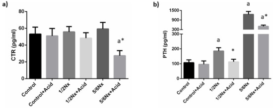 Plasma calcitriol concentrations were not substantially altered by the reduction in renal function. Acidosis tended to decrease plasma calcitriol and significant differences were recorded in 5/6 Nx rats, 27.4 ± 6.1 vs. 59.4 ± 7.7 pg/mL (Figure 3).
