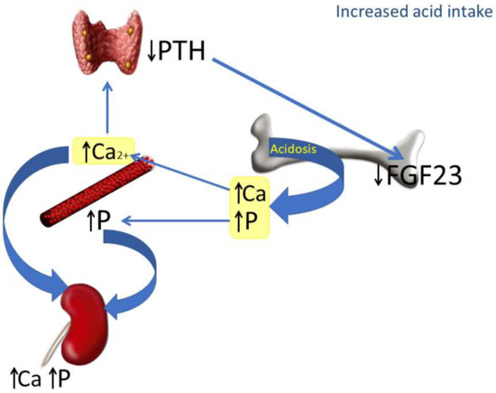 The mechanisms involved in the reduction of FGF23 induced by increased acid intake are depicted in Figure 6. In the context of acidosis, calcium and phosphate are released from bone to buffer the acid load and are abundantly excreted in the urine. The increase in Ca2+ inhibits PTH secretion, which in turn down-regulates FGF23. The decrease in FGF23 makes sense from a regulatory perspective: in the first place, because it is not needed to increase phosphaturia (which is already stimulated by acidosis), and also because of its collateral effects on calcitriol and PTH. A decrease in FGF23 will prevent a further decrease in calcitriol concentrations and will also contribute to avoiding increases in PTH, which could be detrimental for a bone tissue already subjected to the decalcifying influence of acidosis.