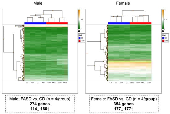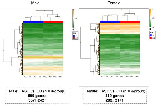 Hierarchical clustering was also performed to compare differences due to sex in diet-segregated data. Distinct gene expression patterns were observed in the sexes: 382 genes (202 downregulated, 180 upregulated) were differentially expressed in CD females compared with CD males, and 452 genes (184 downregulated, 268 upregulated) were differentially expressed in FASD females compared with FASD males (Figure S2). Only 23 mutual changes were observed (Table S7).