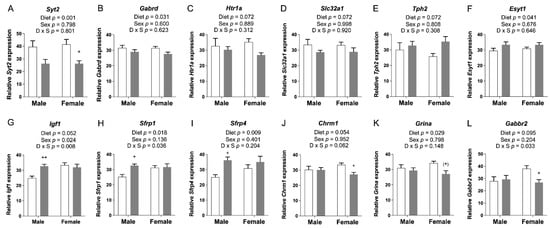 qRT-PCR assessment of candidate gene expression in P30 pup cortices. (A) mRNA levels of Syt2 and (B) Gabrd were significantly decreased in FASD pups. (C) mRNA levels of Htr1a and (D) Slc32a1 showed a trend toward a significant decrease in FASD pups. (E) mRNA levels of Tph2 showed a trend toward a significant increase in FASD pups. (F) mRNA levels of Esyt1 were significantly increased in FASD pups. (G) mRNA levels of Igf1 were significantly increased in FASD male pups, and in females compared with males. (H) mRNA levels of Sfrp1 and (I) Sfrp4 were significantly increased in FASD male pups. (J) mRNA levels of Chrm1 were significantly decreased in FASD female pups. (K) mRNA levels of Grina were significantly decreased in FASD pups, although mainly in females. (L) mRNA levels of Gabbr2 were significantly decreased in FASD female pups. White bars: CD; gray bars: FASD. Values are means ± SEM of 6–8 per group. p-Values from 2-factor ANOVA are indicated at the top of each graph, and Tukey post hoc p-values are indicated as + p < 0.05, ++ p < 0.01, and (+) p = 0.056. CD: control diet; FASD: folic-acid-supplemented diet; D: diet; S: sex; D × S: diet × sex interaction.