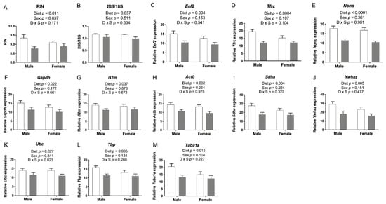 E17.5 cerebral RNA integrity and housekeeping gene expression. (A) RNA integrity number (RIN) and (B) 28S to 18S ribosomal RNA ratios were lower in the FASD group. (C–M) mRNA levels of 11 reference genes: Eef2, Tfrc, Nono, Gapdh, B2m, Actb, Sdha, Ywhaz, Ubc, Tbp, and Tuba1a. Values are means ± SEM of 5–6 per group. White bars: CD groups; gray bars: FASD groups. p-Values from 2-factor ANOVA are indicated in each graph. CD, control diet; FASD, folic-acid-supplemented diet; D: diet; S: sex; D × S: diet × sex interaction.