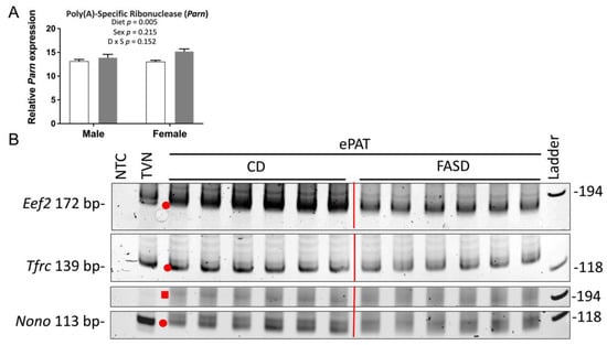 Expression of poly(A)-specific ribonuclease and ePAT reaction products of Eef2, Tfrc, and Nono. (A) mRNA levels of poly(A)-specific ribonuclease (Parn) were significantly increased by FASD. Values are means ± SEM of 6 per group. White bars: CD groups; gray bars: FASD groups. p-Values from 2-factor ANOVA are indicated in the graph. (B) Visualization of representative PCR products of ePAT assay (n = 6/group) for Eef2, Tfrc, and Nono on the polyacrylamide gel. Red dots and square indicate the main ePAT products for each gene in the vicinity of the TVN amplicon or above, respectively. CD, control diet; FASD, folic-acid-supplemented diet; D: diet; S: sex; D × S: diet × sex interaction.