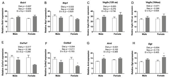 qRT-PCR of candidate genes involved in angiogenesis in embryonic cerebrum. (A) mRNA levels of Rnh1 were significantly increased by FASD. (B) mRNA levels of Nrp1 were significantly decreased in the FASD group. mRNA levels of two Vegfa isoforms, (C) Vegfa 120 and (D) Vegfa 164, showed a trend toward a significant increase by FASD. mRNA levels of (E) Col1a1 and (F) Col4a2 were significantly decreased in the FASD group. mRNA levels of (G) Arnt and (H) Ogt were significantly increased in the FASD group. Values are means ± SEM of 5–6 per group. White bars: CD groups; gray bars: FASD groups. p-Values from 2-factor ANOVA are indicated in each graph. Tukey post hoc p-values are indicated as + p < 0.05. CD, control diet; FASD, folic-acid-supplemented diet; D: diet; S: sex; D × S: diet × sex interaction.