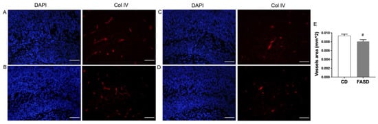 Collagen IV staining in the hippocampus of male embryos. (A,B) Representative images of two CD male embryos. (C,D) Representative images of two FASD male embryos. Left panels: DAPI staining, blue; right panels: collagen IV staining, red. (E) Vessel area was significantly decreased in the hippocampus of FASD males compared with CD males. Values are means ± SEM of 5 mice per group, with 3 sections per mouse. Nested ANOVA p-value is indicated as # p < 0.05. Scale bar = 100 µm.