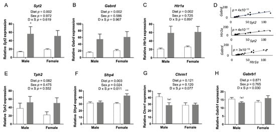 qRT-PCR of genes involved in neurotransmission and neuronal growth and development in embryonic cerebrum. mRNA levels of (A) Syt2, (B) Htr1a, and (C) Gabrd were significantly increased by FASD. (D) Expression of Syt2, Gabrd, and Htr1a showed positive correlations with each other: Syt2 and Gabrd: r = 0.929, p = 4 × 10−11; Syt2 and Htr1a: r = 0.976, p = 4 × 10−17; Htr1a and Gabrd: r = 0.946, p = 3 × 10−13. (E) mRNA levels of Tph2 showed a trend toward a significant increase in the FASD group. (F) mRNA levels of Sfrp4 were significantly increased in the FASD group, especially in FASD females compared with CD females. mRNA levels of (G) Chrm1 and (H) Gabrb1 showed a trend toward significant decreases in FASD males compared with CD males. Values are means ± SEM of 5–6 per group. White bars: CD groups; gray bars: FASD groups. p-Values from 2-factor ANOVA are indicated in each graph. Tukey post hoc p-values are indicated as + p < 0.05, ++ p < 0.01, and unpaired t-test p-values are indicated as (*) p = 0.059. CD, control diet; FASD, folic-acid-supplemented diet; D: diet; S: sex; D × S: diet × sex interaction.