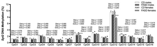 We also observed a significant decrease in methylation by FASD at 7 CpGs out of the 15 studied CpGs in a CpG island of the Syt2 promoter (CpG1: diet, p = 0.004; CpG2: diet, p = 0.016; CpG4: diet, p = 0.013; CpG5: diet, p < 0.001; CpG6: diet, p = 0.016; CpG7: diet, p = 0.002; CpG13: diet, p = 0.050) and a trend toward significance in 2 other CpGs (CpG8: diet, p = 0.056; CpG10: diet, p = 0.064) (Figure 3B and Figure S3B). The decrease in methylation due to diet was primarily in females.