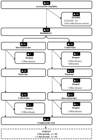 Inclusion criteria were a DAS28 of at least 2.6, unchanged DMARD medication for the past eight weeks prior to screening, 18–75 years of age, and a minimum of two years disease duration. Patients were excluded if they had life-threatening diseases or were pregnant or lactating, allergic to any of the trial foods, or unable to understand the study information.