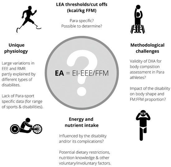 Other factors, such as disability type or severity, may need to be accounted for when it comes to EA assessment in Para athletes [16], and direct measures of EA, including EI, EEE and FFM have only been examined in able-bodied athletes. Figure 1 identifies the main factors that make the EA formula and LEA cut-off/threshold questionable in Para athletes. Recent literature has highlighted that many Para athletes have significant challenges with optimizing EI. When coupled with potentially altered aspects of EEE, EA, and FFM, this could put them at increased risk for LEA and RED-S [5].