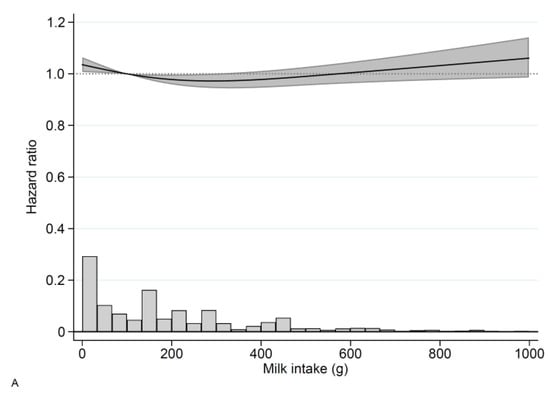 The adjusted restricted cubic spline curve for milk consumption and total stroke is presented in Figure 1A. Compared with an intake of 100 g/day the multivariable-adjusted HRs (Model 2) for milk intake were 1.04 (95% CI 1.01, 1.06) for 0 g/day, 0.98 (95% CI 0.96, 1.00) for 200 g/day, 0.98 (95% CI 0.95, 1.01) for 400 g/day, 1.00 (95% CI (0.96, 1.05) for 600 g/day, and 1.03 (95% CI 0.98, 1.09) for 800 g/day. HRs for the associations of milk consumption in pre-specified categories with total stroke, cerebral infarction, and hemorrhagic stroke are presented in Table S3. No association between milk consumption and total stroke was observed in separate analyses of women and men (Tables S4 and S5).