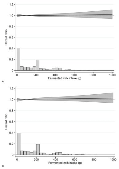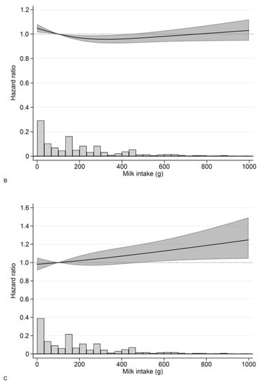Milk consumption was divided into categories <200, 200–399, 400–599, and ≥600 g per day and fermented milk was divided into categories 0, 0–199, 200–399, ≥400 g per day. The cut-offs were selected based on previous studies and represent one glass of milk (200 g) increase for each category [,].