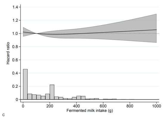 Hazard ratios (solid line) and 95% confidence intervals (gray shaded area) for fermented milk consumption and (A) total stroke, (B) cerebral infarction, and (C) hemorrhagic stroke in The Swedish Mammography Cohort and the Cohort of Swedish Men. A total of 100 g/day was used as reference. The distribution of milk intake is shown in the histogram. Time at risk was accrued between 1 January 1998 and 31 December 2019, with time-updated information in 2008/2009. Covariates included in the model were sex (through stratification), age, educational level, smoking status, physical activity, body mass index, history of hypertension, hypercholesterolemia, diabetes mellitus, coronary heart disease, Charlson’s weighted comorbidity index, vitamin- and mineral supplement use, intakes of total energy, fruit and vegetables, processed meat, soft drinks and juices, alcohol, coffee, milk, total fat, and saturated fat.