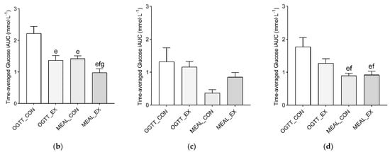 Glycemic time course (a) and time-averaged positive iAUC at 0–60 min (b), 60–120 min (c), and 0–120 min (d) of Study 2. Symbols: e, p < 0.05 vs. OGTT_CON; f, p < 0.05 vs. OGTT_EX; g, p < 0.05 vs. MEAL_CON; and h, p < 0.05 vs. MEAL_EX. The half-box represents the exercise sessions. Values are reported as mean (±SEM).