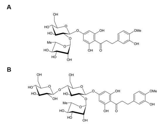 Neohesperidin dihydrochalcone (NHDC) is an intense sweetener. It is extracted and processed from neohesperidin, its parent flavanone [19]. Flavanone glycosides are mainly found in the peels of oranges, and the dihydrochalcone form is synthesized through hydrogenation [20]. NHDC is a semi-natural compound manufactured from neohesperidin, a naturally occurring flavonoid obtained from bitter orange, Citrus aurantium [19,21], and it possesses high solubility and stability. The relative sweetness of NHDC is 250–2000 times higher than a sucrose solution [22,23]. In addition, NHDC can be utilized for masking the bitterness of other compounds [24]. It has been reported that this functional alternative sweetener also exerts antioxidant or anti-inflammatory effects [25,26].