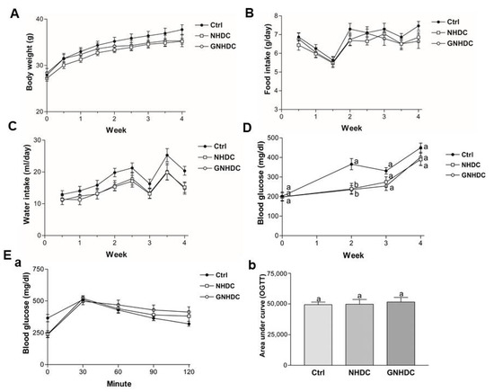Effects of NHDC and GNHDC on body weight, food intake, water intake, fasting blood glucose levels, and OGTT in db/db mice. Body weight, food intake, water intake, fasting blood glucose levels, and OGTT were analyzed in db/db mice. (A) Body weight, (B) Food intake, and (C) Water intake, and (D) changes in fasting blood glucose levels during the experimental period. (E) (a) OGTT and (b) AUC for OGTT are presented. All data are shown as the mean ± SEM (n = 9 per group) and were analyzed by one-way ANOVA with a Newman–Keuls post hoc test. OGTT, oral glucose tolerance test; AUC, area under the curve; Ctrl, db/db mice control; NHDC, db/db mice with neohesperidin dihydrochalcone supplement; GNHDC, db/db mice with NHDC-O-glycoside supplement. The same letter indicates no significant differences (p > 0.05) and different letters indicate significant differences (p < 0.05, ANOVA).