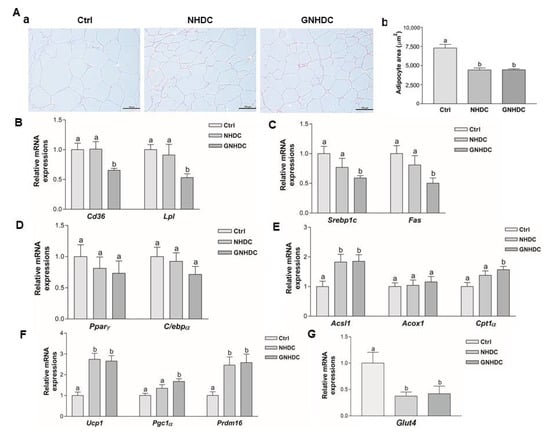 Effects of NHDC and GNHDC on the subcutaneous adipocyte area and the gene expressions for lipid metabolism in subcutaneous adipose tissues. Subcutaneous adipose tissues were analyzed by (A) (a) H&E staining (magnification 200×, scale bar 10 μm) with Ctrl, NHDC, and GNHDC. (b) Adipocyte area of subcutaneous adipose tissues was quantified (n = 3 per group). Expression levels of mRNA were analyzed for (B) fatty acid uptake-related genes, Cd36 and Lpl, (C) lipogenesis-related genes, Srebp1c and Fas, (D) adipogenesis-related genes, Pparγ and C/ebpα, (E) β-oxidation-related genes, Acsl1, Acox1, and Cpt1α, (F) fat browning-related genes, Ucp1, Pgc1α, and Prdm16, and (G) the insulin-responsive glucose transporter gene, Glut4. All data (B–G) are shown as the mean ± SEM quantified (n = 9 per group) and were analyzed by one-way ANOVA with a Newman–Keuls post hoc test. Acox1, acyl-CoA oxidase 1; Acsl1, acyl-CoA synthetase long-chain family member 1; Cd36, cluster of differentiation 36; C/ebpα, CCAAT/enhancer binding protein alpha; Cpt1α, carnitine palmitoyltransferase 1 alpha; Fas, fatty acid synthase; H&E, hematoxylin and eosin; Lpl, lipoprotein lipase; Pgc1α, peroxisome proliferator-activated receptor gamma coactivator 1 alpha; Pparγ, peroxisome proliferator-activated receptor gamma; Prdm16, positive regulatory domain 16; Srebp1c, sterol regulatory element-binding protein 1; Ucp1, uncoupling protein 1; Glut4, glucose transporter type 4; Ctrl, db/db mice control; NHDC, db/db mice with neohesperidin dihydrochalcone supplement; GNHDC, db/db mice with NHDC-O-glycoside supplement. The same letter indicates no significant differences (p > 0.05) and different letters indicate significant differences (p < 0.05, ANOVA).