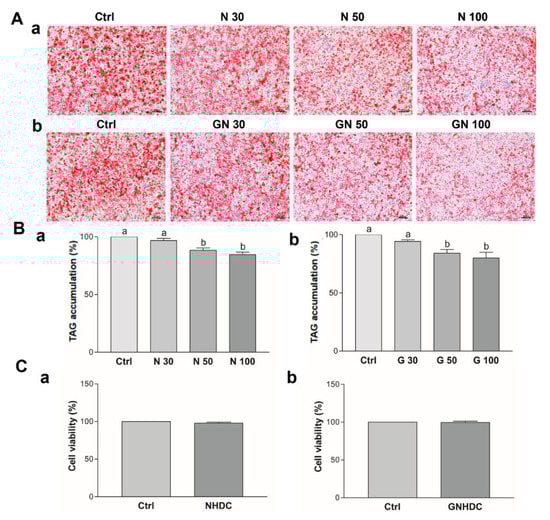 Effects of (a) NHDC and (b) GNHDC on lipid accumulation and cell viability in 3T3-L1 cells. Lipid accumulation was measured by (A) oil red O staining (magnification 100×, scale bar 100 μm) and (B) Triacylglycerol accumulation was quantified with Ctrl, 30 μM, 50 μM, and 100 μM (a) NHDC or (b) GNHDC. (C) Cell viability in 3T3-L1 cells was evaluated with 50 μM (a) NHDC or (b) GNHDC for 8 days by MTT assay. All data are shown as the mean ± SEM and were analyzed by one-way ANOVA with a Newman–Keuls post hoc test or an unpaired Student’s t-test (n = 3). TAG, triacylglycerols; Ctrl, control; NHDC, neohesperidin dihydrochalcone; N 30, 30 μM NHDC; N 50, 50 μM NHDC; N 100, 100 μM NHDC; GNHDC, NHDC-O-glycoside; GN 30, 30 μM GNHDC; GN 50, 50 μM GNHDC; GN 100, 100 μM GNHDC. The same letter indicates no significant differences (p > 0.05) and different letters indicate significant differences (p < 0.05, ANOVA).
