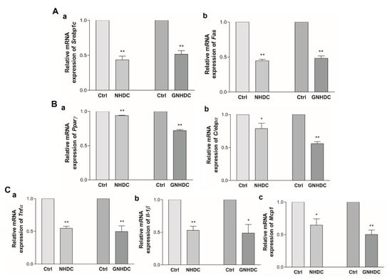 Next, the effects of both sweeteners on proinflammatory cytokines, including Tnfα, Il-1β, and Mcp1, were evaluated (Figure 5C). The mRNA expression of Tnfα decreased by 45.4% with NHDC (p < 0.01) and by 50.3% with the GNHDC treatment (p < 0.01) as compared to each Ctrl group. The expression of Il-1β decreased by 47.0% with NHDC (p < 0.01) and by 51.3% with the GNHDC treatment (p < 0.05) as compared to each Ctrl group. The expression of Mcp1 decreased by 35.5% with NHDC (p < 0.05) and by 49.9% with the GNHDC (p < 0.01) treatment.