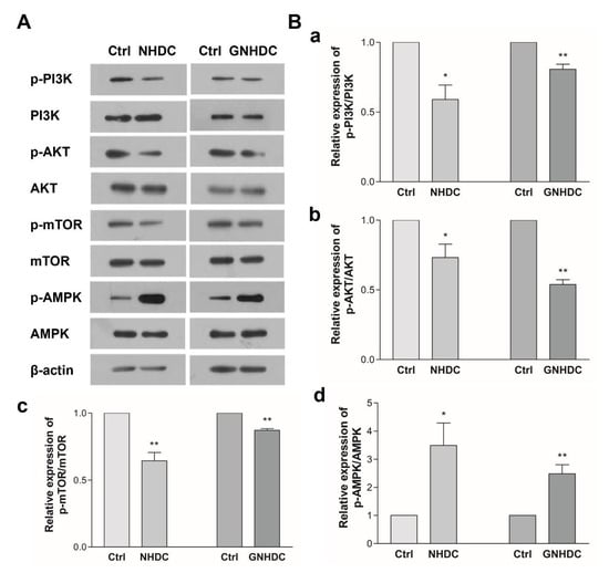 To evaluate the effects of NHDC and GNHDC on the PI3K/AKT/mTOR pathway, western blot analysis was performed (Figure 6). In the present study, the expression of p-PI3K/PI3K decreased by 41.0% with NHDC (p < 0.05) and by 19.3% with the GNHDC treatment (p < 0.01) as compared to each Ctrl group. The expression of p-AKT/AKT decreased by 26.8% with NHDC (p < 0.05) and by 46.1% with the GNHDC treatment (p < 0.01). The expression of p-mTOR/mTOR decreased by 35.6% with NHDC (p < 0.01) and by 12.7% with the GNHDC treatment (p < 0.01). In the present study, expression of p-AMPK/AMPK increased by about 349.3% with NHDC (p < 0.05) and by 248.3% with the GNHDC treatment (p < 0.01).