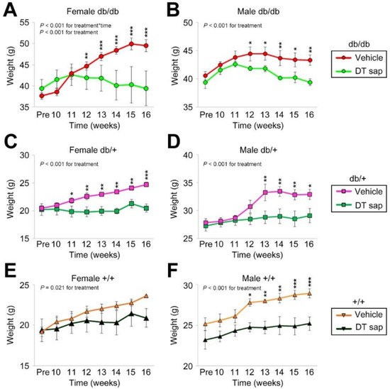 In detail, in female db/db, mice administered with vehicle control exhibited a steady rise in weight gain from week 9 to 15 which then plateaued till week 16, while mice injected with DT sap presented an increase only till week 11, and weight was stabilized thereafter (Figure 1A). Two-way ANOVA showed that there was a significant interaction in treatment x time (p < 0.001) and treatment (p < 0.001). In post hoc analysis, there were significant differences between the body weights of the vehicle group and the body weights of DT sap group throughout week 12~16 (post hoc Holm–Sidak, p = 0.006 at 12 week, p < 0.001 at 13~16 week, Figure 1A). In male db/db, body weights were also suppressed by the DT sap administration (Two-Way Anova, p < 0.001 for treatment, Figure 1B). The vehicle group exhibited a gradual increase in body weight till week 12 and was unchanged thereafter, while the DT sap group showed an increase till week 11 and a slight reduction since then, resulting in significant differences from week 12 to 16 (Holm–Sidak post hoc, p < 0.05 at 12, 13, 15 week, p < 0.01 at 14, 16 week, Figure 1B).