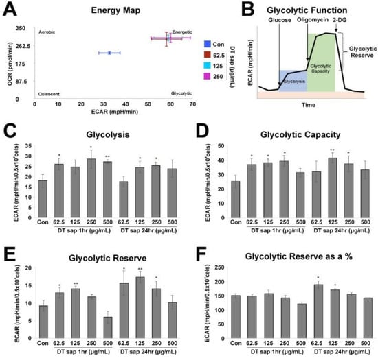 Glycolysis stress test for Dendropanax trifidus (DT) sap in C2C12 cells. (A) Energy phenotype profile of control cells (blue) and cells treated with DT sap of the indicated concentrations for 1 h (red, 62.5 μg/mL; light blue, 125 μg/mL; purple, 250 μg/mL). (B–F) Glycolysis Stress test for measuring glycolytic function in cells by direct measurement of the extracellular acidification rate (ECAR). (B) Agilent Seahorse XF Glycolysis Stress Test profile. Indicated compounds (i.e., 10 mM glucose, 1 μM oligomycin, and 50 mM 2-deoxy-glucose) were sequentially injected. Analysis details (i.e., Glycolysis, Glycolytic Capacity, and Glycolytic Reserve) are indicated. Image modified from Agilent Seahorse XF User Guide of the Test Kit. (C–F) Glycolysis stress test profiles are investigated by measuring ECAR from the cells of control or DT sap-treatment for 1 or 24 h. (C) Glycolysis. (D) Glycolytic capacity. (E) Glycolytic reserve. (F) Glycolytic reserve as a %. Con, Control; DT, Dendropanax trifidus; ECAR, extracellular acidification rate; OCR, oxygen consumption rate. N = 3. Student’s t-test, comparison with the control: * p < 0.05; ** p < 0.01. Bars indicate mean ± S.D.