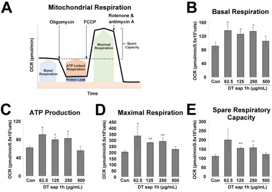 DT sap-treated cells exhibited a higher basal respiration (Student’s t-test, p = 0.024, 0.012, 0.012 for 62.5, 125, 250 μg/mL DT sap, N = 3, Figure 3B). ATP production was increased by DT sap treatment (Student’s t-test, p = 0.018, 0.011, 0.027 for 62.5, 125, 250 μg/mL DT sap, N = 3, Figure 3C). Maximal respiration was also increased by DT sap treatment (Student’s t-test, p = 0.043, 0.0014, 0.0084 for 62.5, 125, 250 μg/mL DT sap, N = 3, Figure 3D). Spare respiratory capacity was significantly increased by DT sap treatment (Student’s t-test, p = 0.0049, 0.0131 for 125, 250 μg/mL DT sap, N = 3, Figure 3E). The Mito Stress Test results showed that DT sap increases mitochondrial respiration in C2C12 muscle cells.