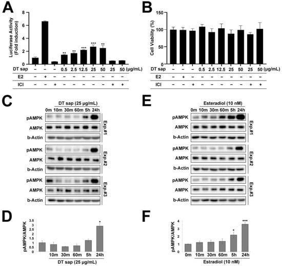 In C2C12 muscle cells, cellular metabolism including glycolysis and mitochondrial respiration was significantly increased by DT sap (Figure 2 and Figure 3). AMPK signaling is an important regulator for muscle metabolism [8]. Therefore, to test whether the metabolism changes observed in C2C12 by DTsap (Figure 2 and Figure 3) are related with AMPK signaling, we investigated AMPK signaling activation in C2C12 cells treated with DT sap over several time periods (0, 10, 30, 60 min, 5 h, 24 h) by western blot. Phosphorylation of AMPK was gradually increased, resulting in a significant increase at 24 h since the initial treatment (Student’s t-test, p = 0.020 at 24 h since the treatment, N = 3 independent experiments, Figure 4C,D). Like DT sap treatment, estradiol treatment also activated AMPK in C2C12 muscle cells, and exhibited the maximum activity at 24 h during the investigated period (24 h) (Student’s t-test, p = 0.036 for 0 vs. 5 h; p = 0.00028 for 0 vs. 24 h, N = 3, Figure 4E,F).