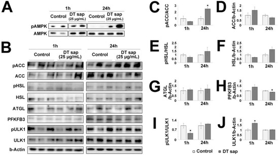 AMPK is a master regulator of cellular metabolism, which is located upstream of various cellular signaling pathways including lipid metabolism, glucose metabolism, autophagy and mitochondrial homeostasis [28]. To investigate further the downstream effects of DT sap on AMPK signaling, we performed western blots against major downstream signaling molecules at 1 h or 24 h after the initial treatment of DT sap. The following molecules were examined: phospho-ACC, ACC, phospho-HSL, HSL, and ATGL for lipid metabolism; PFKFB3 for glucose metabolism; phospho-ULK1 and ULK1 for autophagy and mitochondrial homeostasis (Figure 5). While DT sap did not induce phosphorylation of AMPK at 1 h, it significantly induced phosphorylation of AMPK at 24 h in C2C12 cells (Figure 4C,D and Figure 5A). Phospho-ACC/ACC was not altered at 1 h but significantly increased at 24 h after the treatment (Student’s t-test, p = 0.021 at 24 h since the treatment, N = 3 independent cultures, Figure 5B,C). There were no significant changes in ACC/b-Actin, phospho-HSL/HSL, HSL/b-Actin, ATGL/b-Actin at both time points (Figure 5B,D–G). PFKFB3/b-Actin was not altered at 1 h but significantly decreased at 24 h after the treatment (Student’s t-test, p = 0.048 at 24 h after the treatment, N = 3 independent cultures, Figure 5B,H). Moreover, phospho-ULK/ULK was significantly reduced at 1 h after the treatment but not after that (Student’s t-test, p = 0.043 at 1 h after the treatment, N = 3 independent cultures, Figure 5I). There was a significantly transient increase in ULK1/b-Actin by DT sap at 1 h (Figure 5J), explaining the reduced pULK/1ULK1 by DT sap at 1 h. The Western blot analysis indicates DT sap affects the molecular signaling related with AMPK-ACC within a 24 h time window as well as potential other components in muscle cells.