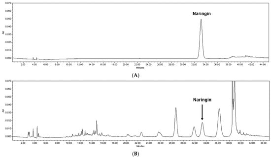 Quantification of naringin from CPE. Representative high-performance liquid chromatography chromatogram (at 280 nm) of the (A) naringin reference standard and (B) CPE prepared at 60 °C. The arrowed peak has been identified as naringin. CPE, Citrus junos Tanaka peel extract.