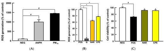 Protective effects of CPE and NAR against PM10-induced oxidative stress in NCI-H460 cell line. (A) ROS generation, (B) intracellular antioxidant activity, and (C) cell viability. All values are expressed as mean ± SEM. p-value less than 0.05 was considered statistically significant. # indicates statistical significance compared to the NEG group, and * indicates statistical significance compared to the POS group. AAPH, 2,2′-azobis(2-methylpropionamidine) dihydrochloride; CPE, Citrus junos Tanaka peel extract; NAR, naringin; PM10, particulate matter 10; Q, quercetin; ROS, reactive oxygen species.