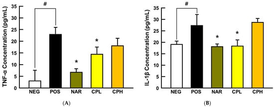 The expression of pro-inflammatory cytokines in the BALF from PM10-treated mice. (A) TNF-α and (B) IL-1β protein expression. All values are expressed as mean ± SEM. p-value less than 0.05 was considered statistically significant. # indicates statistical significance compared to the NEG group and * indicates statistical significance compared to the POS group. CPL, Citrus junos Tanaka peel extract low concentration; CPH, Citrus junos Tanaka peel extract high concentration; NAR, naringin; NEG, negative control; POS, positive control.