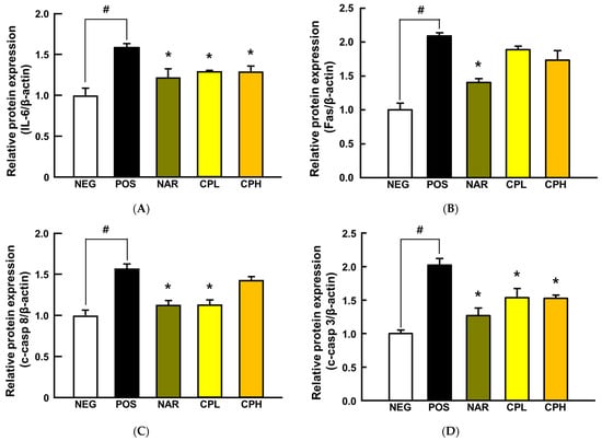 The expressions of pro-inflammatory cytokine- and apoptosis-related proteins in PM10-induced lung damage. (A) IL-6, (B) Fas, (C) c-caspase-8, and (D) c-caspase-3 expression. All values are expressed as mean ± SEM. p-value less than 0.05 was considered statistically significant. # indicates statistical significance compared to the NEG group, and * indicates statistical significance compared to the POS group. CPL, Citrus junos Tanaka peel extract low concentration; CPH, Citrus junos Tanaka peel extract high concentration; NAR, naringin; NEG, negative control; POS, positive control.