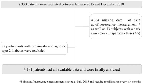 - van Waateringe, R.P.; Fokkens, B.T.; Slagter, S.N.; van der Klauw, M.M.; van Vliet-Ostaptchouk, J.V.; Graaff, R.; Paterson, A.D.; Smit, A.J.; Lutgers, H.L.; Wolffenbuttel, B.H.R. Skin autofluorescence predicts incident type 2 diabetes, cardiovascular disease and mortality in the general population. Diabetologia 2019, 62, 269–280. [Google Scholar] [CrossRef] [Green Version]