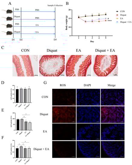 As shown in Figure 1B, mice stimulated with diquat had significantly lower body weight than the mice in the CON group. The Diquat + EA group had higher body weight than the Diquat group (p < 0.05), which indicated that EA alleviated the diquat induced body-weight loss to some extent. At the same time, EA treatment alleviated intestinal villi damage caused by diquat (Figure 1C) and reduced the ROS content in the jejunum (Figure 1G). The ALT activity (parameters of hepatoxicity) of the Diquat group on day 5 was the highest among the four groups (Figure 1F) (p < 0.05). Both the EA group and the EA + Diquat group lowered ALP and ALT activity when treated with 100 mg/kg EA for 5 days after the diquat injection (p < 0.05). Additionally, as shown in Figure S1, EA treatment shortened the time to return to initial body weight after diquat injection.