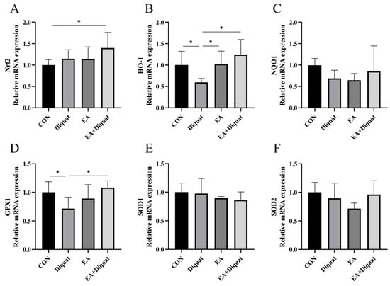 Nrf2 is a key sensor and transcription factor of the antioxidant system []. When ROS is overproduced in the body, Nrf2 in the cytoplasm moves into the nucleus and regulates the gene expression of downstream antioxidant enzymes such as HO-1, NQO1 and GPX1 []. Therefore, the expression levels of Nrf2 and its downstream genes were detected in this study. The results showed that EA supplementation significantly increased gene expression of Nrf2 and downstream antioxidant enzymes HO-1 and GPX1 regardless of supplementation before or after diquat stimulation. Interestingly, EA supplementation without diquat stimulation did not increase gene expression levels of Nrf2 and downstream antioxidant enzymes. A previous study showed similar results, suggesting that EA increased Nrf2, HO-1 and NQO1 levels only under rotenone stimulation []. We speculate that this may be because EA activates the antioxidant system only in response to oxidative stress. The results suggest that EA can alleviate or prevent diquat-induced oxidative stress by increasing the expression of antioxidant enzymes through activating the Nrf2 mediated signaling pathway.