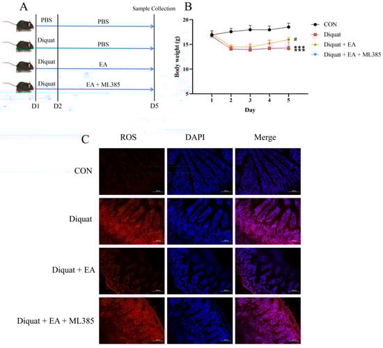 Specific Nrf2 inhibitor (ML385) inhibited the therapeutic effects of ellagic acid on weight loss and increased the ROS level in the jejunum caused by diquat. (A) Experimental grouping scheme. (B) Body weight curve of mice. (C) ROS level in the jejunum. All data were presented as mean ± S.E.M (n = 4–6). *** means p < 0.001 when this group compared with the CON group, # means p < 0.05 when this group compared with the Diquat group and the Diquat + EA + ML385 group. PBS, phosphate buffer saline; CON, control; EA, ellagic acid; ROS, reactive oxygen species; DAPI, 4′,6-diamidino-2-phenylindole.