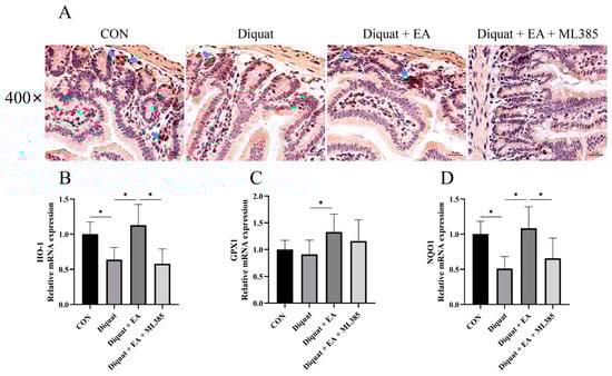 Further, we examined Nrf2 expression with immunohistochemistry and related gene mRNA expression of the mice’s jejunum tissue on day 5. As shown in Figure 4, therapeutic treatment with EA (100 mg/kg BW/day) significantly increased Nrf2 immunostaining in the jejunum tissue after diquat injection in mice, while ML385 (specific Nrf2 inhibitor) inhibited the Nrf2 immunostaining as expected. The Diquat + EA group had significantly increased the NQO1, GPX1 and HO-1 mRNA expression of the mice’s jejunum tissue on day 5 compared with the Diquat group (p < 0.05), which was inhibited by the ML385 as shown by the gene expression in the Diquat + EA + ML385 group compared with the Diquat + EA group.