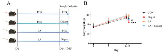 Therapeutic experiment 2: Twelve mice were randomly assigned to two experimental groups (n = 6/group; body weight 15.50 ± 0.73 g): i. Diquat group, every mouse was intraperitoneally injected with 25 mg/kg BW diquat dissolved in 200 μL PBS on day 1, then orally administered with 100 μL PBS every day; ii. Diquat + EA group, every mouse was intraperitoneally injected with 25 mg/kg BW diquat dissolved in 200 μL PBS on day 1, and then orally administered with 100 mg/kg BW EA every day. EA (100 mg/kg BW/day) was prepared in suspension in PBS with 100 μL per mouse. (Figure S1a). The time required for each mouse to recovery to its initial body weight before diquat injection was recorded.