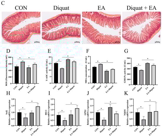 Finally, we investigated the preventive effect of EA on diquat challenged mice. As shown in Figure 5B, only EA treatment did not change the body weight of mice, compared with the CON group. Diquat stimulation on day 15 obviously caused body weight loss of mice, and oral administration of EA for 14 days significantly alleviated body weight loss induced by diquat in mice (Figure 5B). EA treatment significantly increased T-AOC and GSH-Px activity, and reduced ROS and MDA levels in serum (Figure 5D–G). As shown in Figure 5H–K, diquat stimulation decreased mRNA expression of Nrf2, HO-1, NQO-1 and GPX1 in the jejunum (p < 0.05). However, EA pre-treatment to the diquat-challenged mice increased Nrf2, GPX1 and HO-1 gene expression (p < 0 05), potentially indicating that EA alleviated diquat induced oxidative stress by the Nrf2 mediated signaling pathway.