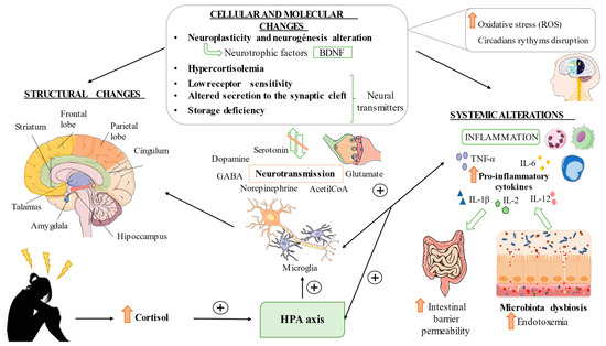 General pathophysiology of MDD. Elevated stress affects the HPA axis involving cellular and molecular changes, resulting in brain structural and functional changes. For instance, abnormal neurotransmission, microglial activation, neuronal damage and dysregulation of neuroplastic and neurotrophic factors can be reported in patients with MDD. These alterations are frequently accompanied by enhanced oxidative stress and circadian rhythms disruption. Exacerbated systemic inflammation and gut dysbiosis and enhanced intestinal barrier permeability are also major characteristics of patients with MDD. It is of note that all these mechanisms boost each other, perpetuating the damage and pathologic environment related to MDD.