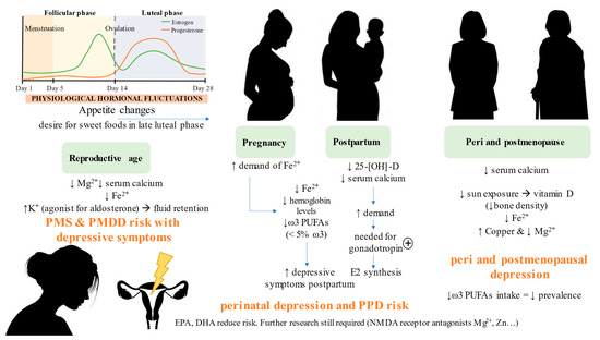 Importantly, plenty of studies have been found to be related to specific micronutrient deficiencies at reproductive age, postpartum and later life; all of them are to be regarded as potential risk factors for different manifestations of depression. For this reason, it is of note to consider the different moments of life in women to manage specific requirements they may need with the aim to improve their prognosis in the case of diagnosed MDD, or to prevent the onset.