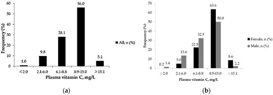 Subjects with sufficient plasma vitamin C (≥8.9 mg/L) was more common in females than in males (72.2% vs. 52.2%, respectively, p < 0.001). This indicates that males had a dominant tendency of having insufficient plasma vitamin C (47.8% in males and 27.8% in females, p < 0.001) (Figure 1b).