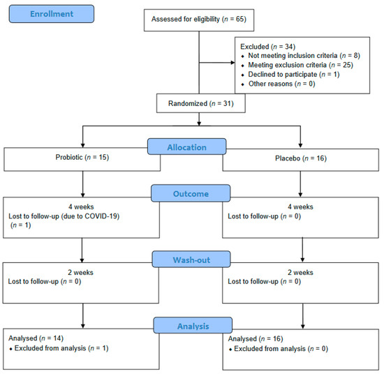 Figure 1 shows the patient flow diagram. Of the 31 individuals included in this study, 30 completed the entire study protocol. One participant from the probiotic group was lost to follow-up due to sickness not related to the intervention (COVID-19). No adverse effects were registered.