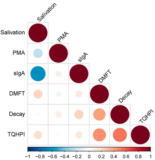 Correlation analysis. TQHPI—Turesky modification of the Quigley-Hein plaque index; DMFT—decayed, missing, and filled teeth index; sIgA—secretory immunoglobulin A; PMA—papillary marginal attached index.