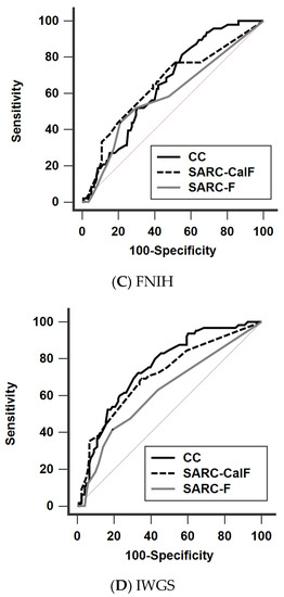 The diagnostic performance of SARC-F, SARC-CalF, and CC against the four different definitions is shown in Figure 2 (Figure 2A: AWGS 2019, Figure 2B: EWGSOP2, Figure 2C: FNIH, Figure 2D: IWGS) and Table 4. In general, the AUCs of CC (range 0.652–0.813) and SARC-CalF (range 0.648–0.748) were significantly higher than those of SARC-F (range 0.587–0.625) across the different definitions, except when applying FNIH. Furthermore, CC significantly outperformed SARC-CalF when AWGS 2019 was adopted. The trend of the diagnostic performance remained unchanged in our subgroup analysis, stratified by age and PD duration (Supplementary Materials, Tables S1 and S2).