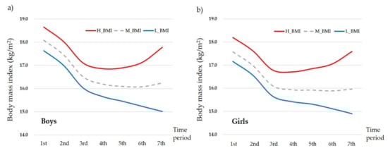 Changes in average body mass index (BMI) for the seven time periods by (a) boys and (b) girls. H_BMI: higher BMI group whose BMI at the 7th time period was higher than the average BMI at the 7th time period; L_BMI: lower BMI group whose BMI at the 7th time period was lower than the average BMI at the 7th time period; M: average BMI group based on the 7th time period.