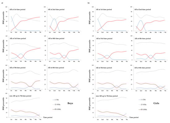 Figure 2a,b present the distribution of BMI percentile for the seven time periods according to each time period and AR onset by sex (a: boys, b: girls). Among the boys, 60.99% of those who had experienced AR in the 1st time period showed BMI level below the 15th percentile based on the WHO child growth standards which indicates underweight. Specifically, 35.56% of the boys showing BMI levels below the 5th percentile indicating severe underweight in this period belonged to the group experiencing AR in the 1st time period (Table S2). Interestingly, 57.96% of boys with AR in the 1st time period became overweight or obese indicating BMI levels above the 85th percentile in the 7th time period. Among the girls, 51.0% of those who had experienced AR in the 1st time period had BMI levels below the 15th percentile, and 47.06% of the girls with BMI levels below the 5th percentile indicating severe underweight in this period belonged to experiencing AR in the 1st time period (Table S3). In addition, more than half of them were underweight in the 1st time period, but 47.82% of them were found to be overweight or obese in the 7th time period. The boys experiencing AR in the 2nd time period (51.32%) were underweight in this time period, but 58.96% of this group became overweight or obese in the 7th time period. Among girls, 44.26% of those with AR in the 2nd time period were underweight in this time period, but 45.44% of this group became overweight or obese in the 7th time period. During the 3rd time period, proportions of underweight among the children experiencing AR in this time period (boys: 25.83%, girls: 19.91%) were relatively higher than those experiencing AR in other time period, but the proportions of overweight and obesity in this group (boys: 50.44%, girls: 36.73%) were also higher than those of underweight or normal weight at the 7th time period. Collectively, children experiencing AR during the 1st, 2nd, and 3rd time periods showed higher proportions of underweight, but lower proportions of overweight and obesity in the corresponding time periods. That is, children experiencing AR before the age of 2 years (1st~3rd time periods) showed the continuously increasing patterns of being overweight and obese. These patterns were more obvious when the AR occurred at an earlier time.