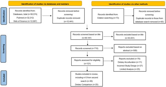 The search strategy produced a total of 56,647 results from database (n = 56,574) and manual searches (n = 73). Following the removal of duplicates, n = 43,431 studies were excluded based on title, n = 589 were excluded based on abstract and n = 78 studies were excluded based on full text (Figure 1). Following a second database search, a total of 49 studies were included after full text articles were screened against the eligibility criteria. Of these studies n = 25 looked at diet only, n = 11 examined influences of food choice only and n = 13 examined both.