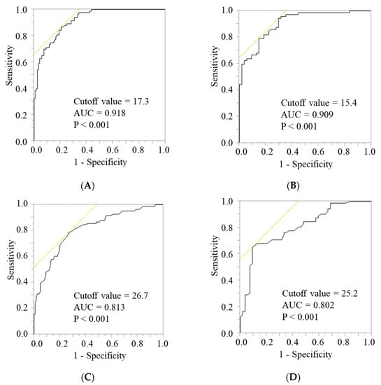 In this study, we focused on the FFMI and AC because the FFMI has been proposed as a useful alternative measure of the RMM [], and AC has been widely used in clinical settings because of its low cost and availability. It was reported that AC was positively correlated with the SMI calculated by DXA []. It was reported that there are race-related differences in the values for the SMI, FFMI, and AC, which are lower in Asian populations than in Western populations, when compared among people of the same ages of each sex [,,,]. Therefore, the cutoff value for the RMM must be calculated for Asian demographics [,].